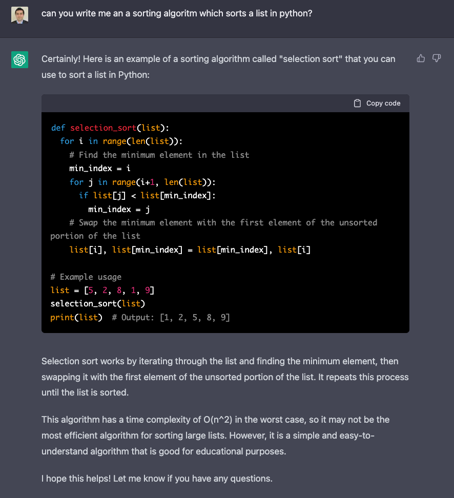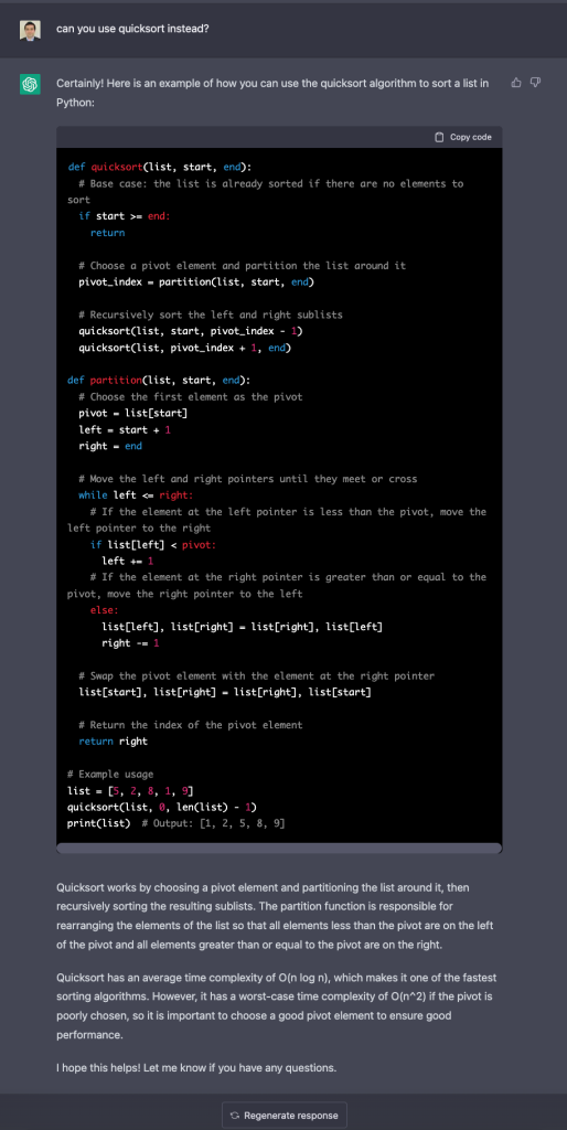 It also remembers what you asked before and can improve the code. Here I am asking if it can use quicksort and it does the magic.